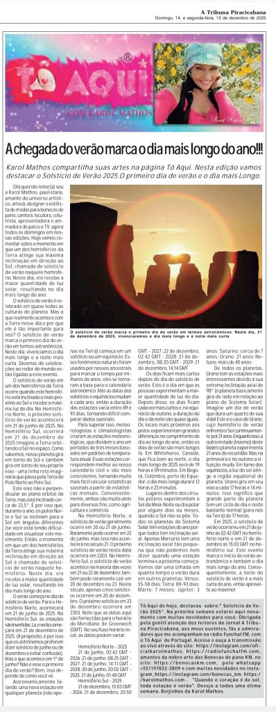Todos os domingos em editorial no Jornal “A Tribuna Piracicabana”, comentando um pouco sobre: artesanato, moda, maquiagem, costura, desfiles e passarelas, crochê, dicas em geral, tecidos, jardinagem, culinária, decoração, música e muito mais. É todos os domingos em edição digital do “Tô Aqui” no site: https://www.atribunapiracicabana.com.br e nas melhores bancas de jornal de Piracicaba e região.