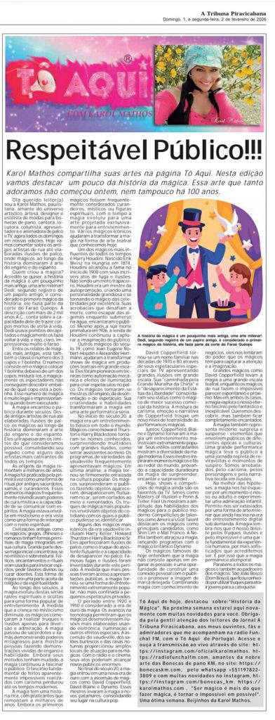 Todos os domingos em editorial no Jornal “A Tribuna Piracicabana”, comentando um pouco sobre: artesanato, moda, maquiagem, costura, desfiles e passarelas, crochê, dicas em geral, tecidos, jardinagem, culinária, decoração, música e muito mais. É todos os domingos em edição digital do “Tô Aqui” no site: https://www.atribunapiracicabana.com.br e nas melhores bancas de jornal de Piracicaba e região.